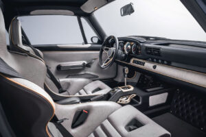 The reborn flat six is based on the Type 964’s engine and develops over 700HP and 750Nm of torque with 3.8L capacity, 4-valves per cylinder, twin turbochargers with variable turbine geometry, water-cooled cylinder heads, air-cooled cylinders and an electrically powered horizontal fan. DLS Turbo services incorporate a twin-turbocharged, 9000rpm, 3.8L flat six, restored and developed by Singer, combining expertise in turbocharging with the remarkable engine developed through DLS services. Latest generation ABS, traction control, and electronic stability control, developed with Bosch, are combined with selectable drive modes, a manual six-speed gearbox and rear-wheel drive.